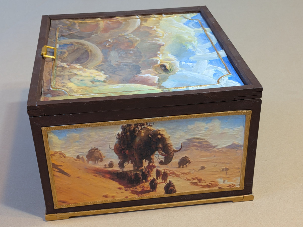 The exterior is adorned with hand‑crafted decoupage artwork, layered over a harmonizing 3D‑printed bas‑relief texture. The result is a tactile, richly detailed surface that feels as though it was lifted from the pages of an ancient spellbook.